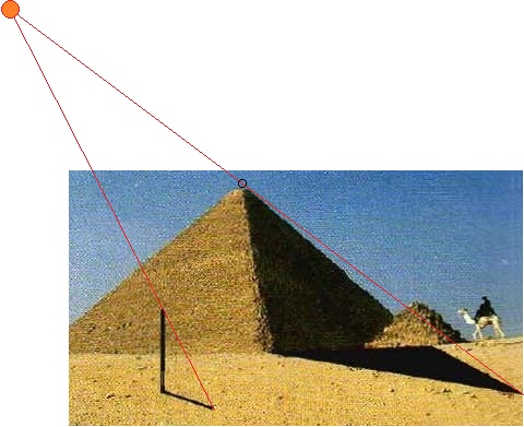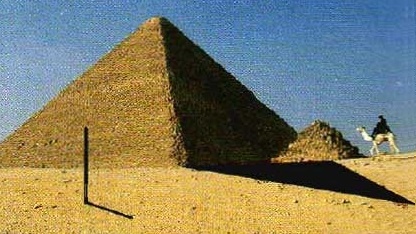 Una piramide e un bastone, piantato verticalmente, e le loro ombre. Traccia, fuori dalla fotografia, dove è il sole.