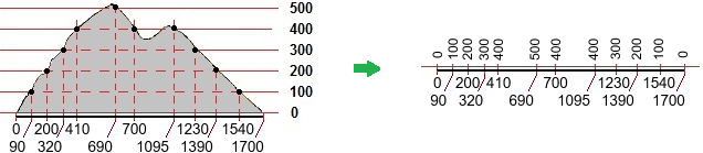 Ecco un esempio di come descrivere il profilo di un'isola, quella sotto rappresentata a sinistra. Partendo dal livello del mare e andando avanti di 1700 metri si ritorna al livello del mare. Si arriva alla quota di 100 m dopo 90 m di avanzamento orizzontale, alla quota di 200 m dopo 200 m di avanzamento orizzontale, alla quota di 300 m dopo 320 m di avanzamento orizzontale, alla quota di 400 m dopo 410 m di avanzamento orizzontale, alla quota di 500 m dopo 690 m di avanzamento orizzontale, si ritorna alla quota di 400 m dopo 700 m di avanzamento orizzontale, ... A destra sono indicati (sotto alla linea dei numeri, da 0 a 1700) gli avanzamenti per arrivare alle varie quote (indicate sopra alla linea dei numeri).