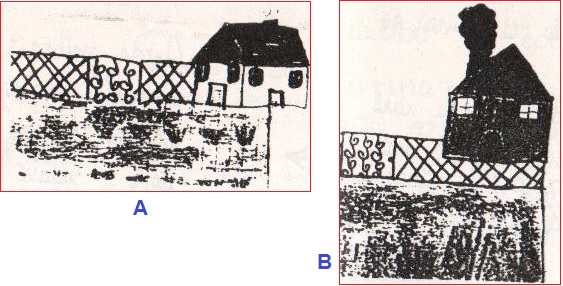 Due particolari dei disegni della stessa casa di campagna fatti da un bambino di 6 anni, in due successive uscite fatte con la classe. Qual è il disegno fatto subito dopo la prima uscita? Perché?