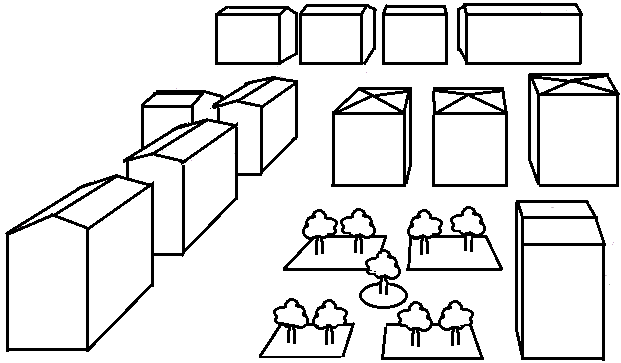 A lato è riprodotto un gruppo di case visto da un grattacielo poco lontano da esse. Quale tra i due disegni seguenti potrebbe rappresentare come si vedrebbe questo gruppo di case da un elicottero che vola sopra di esse? |