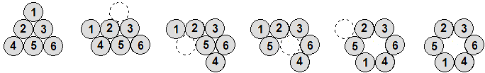 Sei monete vengono disposte su una superficie piana a formare un triangolo come mostrato nella figura a sinistra. Vogliamo spostarle, con il minor numero di movimenti, in modo da disporle come mostrato nella figura a destra. E vogliamo che ogni movimento consista nel far scorrere una moneta da una posizione in un'altra, senza spostare le altre, in modo che continui a toccare due altre monete. Quanti movimenti sono necessari? | ![]() |
