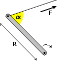 3) Posso procedere in due modi: considerare il prodotto tra l'intensità della componente di F perpendicolare a R e l'intensità R di R; la componente ha intensità F·sin(α), dove F è l'intensità di F; quindi il momento è F·R·sin(α). Oppure si può considerare il prodotto tra l'intensità della forza e la distanza del centro di rotazione dalla retta lungo cui agisce F, ossia la componente di R perpendicolare a F; anche procedendo in questo modo otteniamo F·R·sin(α).