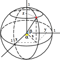 Vediamo come trasformare le coordinate geografiche nelle coordinate cartesiane, ovvero come passare, riferendosi al punto rosso della figura a lato, da α e β ad x, y e z. s = cos(β), z = sin(β), x = cos(α)*s, y = sin(α)*s I nostri dati (trasformati in radianti con "convert degrees in radiant") sono: |