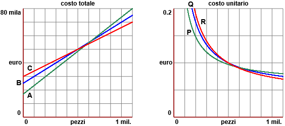 Sotto a sinistra sono riprodotti i grafici del costo totale in funzione del numero di pezzi prodotti per tre diverse produzioni (non particolarmente complesse, in modo che i costi possano essere distinti in due sole categorie: costi fissi annui indipendenti dal volume di produzione e costi incorporati). A destra sono riprodotti i grafici del costo unitario. Quali sono i grafici relativi alla produzione con costi incorporati minori? (A) C e R (B) C e P (C) A e R (D) A e P (E) B e Q |