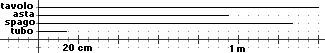 Un tubo è lungo 143 mm; uno spago è lungo 1.27 m; un'asta è lunga 95 cm; un tavolo è lungo 1.4 m.