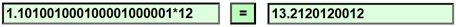 È evidente che il doppio di 1.101001000100001 è 2.202002000200002 : se raddoppio tutte le cifre otterrò un numero che corrisponde ad punto che ha distanza doppia dal punto che corrisponde a 0. Analogamente 1.101001000100001 per 9 fa 9.909009000900009 Ma quanto fa 1.101001000100001 per 12?