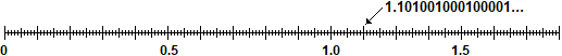 Sotto è indicata la posizione sulla linea dei numeri di 1.101001000100001 (con uno "0" in più tra un "1" e il successivo "1").