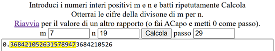 Per 7/19 ottengo quanto segue, concludendo che il periodo è 368421052631578947, lungo 18 cifre: