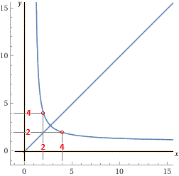 Se si estende il significato di potenza fino a considerare gli esponenti non interi, si possono trovare altre coppie di numeri x e y positivi che, pur essendo diversi, siano tali che xy = yx. Per studiare questo fenomeno sono necessarie conoscenze matematiche abbastanza avanzate. Ad esempio si può trovare che le coppie di numeri x e y per cui ciò accade hanno la seguente rappresentazione grafica (la semiretta y=x, x>0 corrisponde al fatto che se x=y xy = yx). A lato la rappresentazione di x^y = y^x realizzata con |