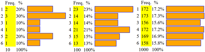 Se usiamo il lancio mediante il computer (usando un programma che si comporta in modo simile a quello del lancio di un dado) per 10, 100 e 1000 volte (ma facendo tutto in pochi secondi) otteniamo esiti come i seguenti:
