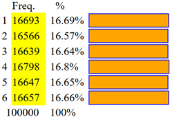 Si vede che le frequenze (172, 173, ..., 158) tendono a diventare uguali o, meglio, i rapporti tra queste frequenze e il totale dei lanci (rapporti che vengono chiamati "frequenze relative" perché i valori vengono messi in relazione col totale dei lanci), ossia 172/1000, 173/1000, ..., 158/1000, tendono ad avere una differenza l'uno dall'altro che si avvicina sempre più a 0. In altre parole, le diverse colonne dell'istogramma tendono ad assumere la stessa forma. Ecco cosa si può ottenere con 100 mila lanci: