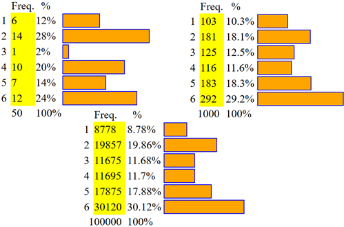 Se si fanno molte prove si ottiene un istogramma come quello a fianco, in cui le colonne non sembrano avvicinarsi. Facciamo una cosa analoga col calcolatore, con un programma preparato in modo da comportarsi in modo simile ad un dado costruito col cartoncino, con la stessa disposizione dei pallini. Premiamo QUI e proviamo a fare 50, 1000 e 50 mila lanci. ![]() ![]() | ![]() |