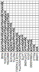 con una crocetta gli alimenti che i propri bisnonni usavano almeno 3 volte la settimana. Ad esempio i bisnonni di 17 alunni mangiavano polenta almeno 3 volte la settimana e quelli di 5 alunni mangiavano formaggio almeno 3 volte la settimana. Suppongo che questo fosse il modo in cui a quei tempi mangiavano mediamente gli italiani. Posso allora dire che solo 5 italiani su 21 mangiavano formaggio almeno 3 volte la settimana, ovvero (vedi la figura seguente) solo 24 su 100. In altre parole la probabilità che all'epoca un italiano mangiasse formaggio almeno 3 volte la settimana era grosso modo del 24%. Qual era la probabilità che un italiano mangiasse pane almeno tre volte la settimana? E quella che mangiasse polenta? E quella che mangiasse pollo? |