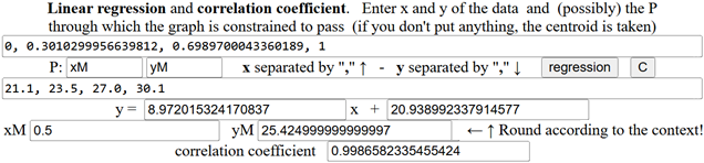 I calcoli posso farli con "calcolatrice2" presente qui (metto 1,2,3,5,10 in "data" e clicco [Log]). Poi uso "retta regressione":