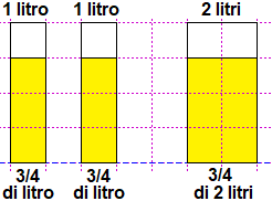 Posso anche pensare che 3/4 di litro li posso esprimere come 75 cl; il suo doppio è 150 cl, ovvero 1 litro e mezzo. Ovvero posso pensare che 3/4 = 75% = 0.75; il suo doppio è 0.75·2 = 1.5.