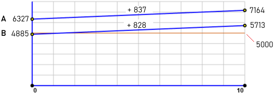 Se la popolazione iniziale di A fosse stata 100 dopo 10 anni sarebbe diventata 113.2. Se la popolazione iniziale di B fosse stata 100 dopo 10 anni sarebbe diventata 116.9.&npsp; Rispetto a 100 la prima è aumentata di 13.2 la seconda di 16.9.