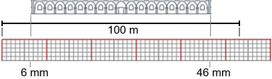 100 metri corrispondono a poco più di 53 millimetri. Un millimetro corrisponde a 100/53. La lunghezza del palazzo corrisponde un tratto di carta millimetrata che va da 6 a 46 millimetri, ossia lungo 40 millimetri.