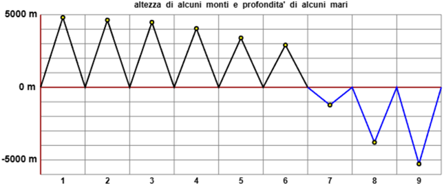 Sotto sono rappresentate le altezze di alcuni monti (Bernina, Bianco, Cervino, Etna, Gran Sasso, Rosa) e le profondità di alcuni mari (Adriatico, Ionio, Tirreno). Associa a ciascun numero (1, 2, ..., 9) il monte o il mare rappresentato (cerca eventualmente informazioni sulla altezza o la profondità dei monti e dei mari citati).