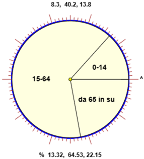 La popolazione "0-14" è circa 1/5 di quella "15-64", mentre gli spicchi corrispondenti sono l'uno circa 1/3 dell'altro. La popolazione "15-64" (40.2 mil.) è il doppio della rimanente (8.3+13.8 = 22.1 mil.) mentre il primo spicchio è quasi uguale alla somma degli altri due. Queste, ed altre possibili osservazioni, consentono di concludere che l'areogramma non è corretto. Oppure potremmo calcolare le percentuali. Calcolo 8.3/(8.3+40.2+13.8) per 100: 8.3/62.3*100 = 13.322632423756; 40.2/62.3*100 = 64.526484751204; 13.8/62.3*100 = 22.15088282504. Dunque, arrotondando: 13.3%, 64.5%, 22.2%. Sull'areogramma presente nel quesito leggiamo invece (usando le tacche) 19%, 66%, 25%, percentuali diverse dalle precedenti. A sinistra l'areogramma corretto. |