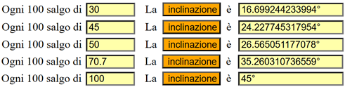 Sotto l'inclinazione corrispondente alle diverse pendenze, calcolata con la semplice calcolatrice "calcoli" presente QUI: