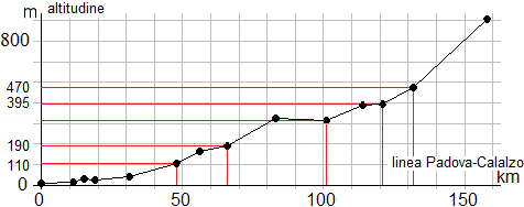 Utilzzando il seguente quadro e il seguente grafico relativo alla linea ferroviaria Padova-Calalzo, ricava (arrotondata alle decine di metri) l'altitudine (delle stazioni) di Montebelluna, Fener, Bribano, Polpet e Longarone.