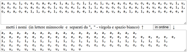 Per gli insegnanti. Si possono fare molti esercizi di questo genere. L'insegnante per prepararli può anche usare del software. In questo caso può mettere tutte le vocali nello script "ordina parole" per contare le varie vocali (può inserire degli "a capo" nell'uscita in modo da facilitare il conteggio) e poi utlizzare lo script "istogramma a barre" (script presenti qui)