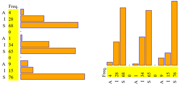 Introducendo A 62 | I 22 | S 16 | niente | A 19 | I 39 | S 42| niente | A 4 | I 28 | S 68 ottengo gli istogrammi a sinistra o (ruotando l'immagine) quelli a destra (si è messo a destra di HELP un numero più piccolo di 100 per ridurre le altezze delle colonne):