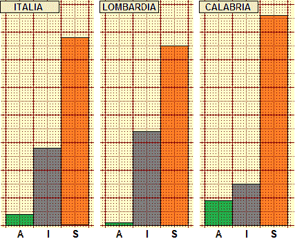 Italia 1901 Italia 1971 Italia 2011 A:62 I:22 S:16 A:19 I:39 S:42 A:4 I:28 S:68 Lombardia 2011 Calabria 2011 A:1 I:34 S:65 A:9 I:15 S:76