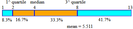 A = 1, B = 13, intervalli = 12 di ampiezza 1, n = 45 min = 1, max = 13, mediana = 4 1^|3^ quarto = 2|8, media = 5.511