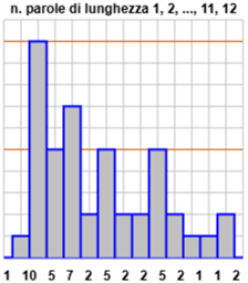 Inizio, Considera, questo, periodo, dall', inizio, alla, fine, Classifica, le, parole, che, compaiono, in, esso, rispetto , alla , lunghezza, Rappresenta, graficamente, la, distribuzione, di, queste, lunghezze, sia, con, un, istogramma, che, con, un, box-plot, Determina, la, media, la, moda, e, la, mediana, di, tale, distribuzione, Fine @