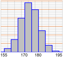 Del resto è noto che le altezze si distribuiscono in modo rappresentabile con un istogramma simmetrico dalla forma a campana (istogramma sotto a sinistra). La stessa cosa non accade per il peso (istogramma sotto a destra) e, come ora abbiamo visto, per la circonferenza toracica. Vedi gli esercizi 3 e 5 in fondo alla voce "distribuzione".