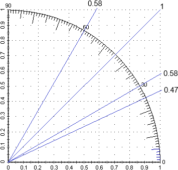 | (a) Traccio il segmento che passa per (0,0) e ha un'inclinazione di 25°, e trovo che l'ordinata del punto di ascissa 1 che sta su di esso è, circa, 0.47, ossia 47%. (b) Procedendo come sopra, trovo i valori 0.58 = 58%, 1.00 = 100%. Nel caso del segmento che passa per (0,0) e ha un'inclinazione di 60° trovo che l'ascissa nel punto di ordinata 1 che sta su di esso è circa 0.58. Quindi la sua pendenza è circa 1/0.58 = 1.72413..., arrotondando 170%. | ||