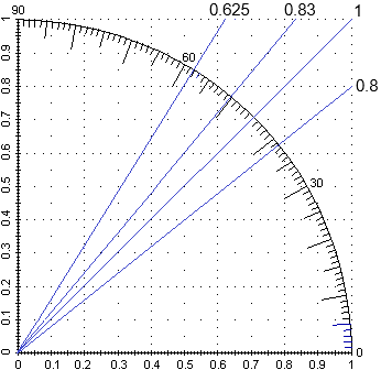 | c) Traccio il segmento che congiunge (0,0) con il punti di ascissa 1 che ha ordinata 0.80 = 80%. Trovo un'inclinazione di circa 38.5°. Per la pendenza del 120% individuo prima il segmento di ordinata 1 che ha tale pendenza: la sua ascissa x è tale che 1/x = 120/100 = 1.2, x = 1/1.2 = 0.8333... Poi traccio il segmento che congiunge (0,0) con (0.83,1) e trovo circa 50.2°. Analogamente per la pendenza 160% faccio: 1/x = 1.6, x = 1/1.6 = 0.625. Poi traccio il segmento da (0,0) a (0.625,1) e trovo circa 58°. |