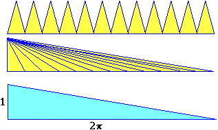 nell'illustrazione precedente può essere scomposto in 12 triangoli uguali, che possono essere trasformati in triangoli di uguale base e uguale altezza tali che la loro unione formi un triangolo della stessa altezza e avente come base il perimetro del poligono. Questo triangolo ha la stessa area del poligono. Posso ripetere questa trasformazione per ogni n-agono (a 24, 48,