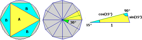 Per calcolare l'area di uno di questi n-agoni basta (sempre per la proprietà additiva) calcolare l'area di uno degli n triangoli aventi un vertice nel centro in cui può essere scomposto l'n-agono e moltiplicarla per n. Sopra è illustrato come calcolarla nel caso del dodecagono: se considero come base il lato opposto al centro, i triangoli hanno base = 2·sin(15°) e altezza = cos(15°), e quindi area = sin(15°)·cos(15°). L'area del dodecagono è quindi 12·sin(15°)·cos(15°).