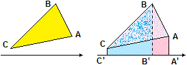 | Consideriamo un triangolo come composto da tante striscioline disposte parallelamente a uno dei tre lati, ad es. come se fosse realizzato con tante cannucce da bibita. Se facciamo scorrere le striscioline in modo che le loro estremità rimangano allineate, nel corso del movimento il triangolo cambia forma ma mantiene la stessa area (la somma delle aree di tutte le striscioline). Indichiamo con l la lunghezza del lato che rimane fisso e con h la distanza tra la retta a cui esso appartiene e il vertice opposto. Durante il movimento h non varia. | ![]() |