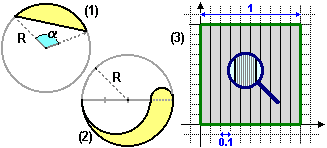| Per determinare l'area del cerchio x2+ y2 = 1 (o meglio, x2+ y2 ≤ 1, dato che ci riferiamo anche ai punti interni) possiamo procedere sia direttamente approssimandola con unioni di quadretti, sia utilizzando opportunamente la proprietà additiva. Il primo metodo è illustrato nella figura a lato nel caso dei quadretti di lato 0.1 e per un quarto di cerchio; per gli altri tre quarti la situazione è analoga. Vi sono 67·4 = 268 quadretti contenuti, per cui 2.68 è una approssimazione per difetto; contando anche i quadretti a cavallo del bordo otteniamo 86·4 = 344 quadretti, per cui 3.44 è una approssimazione per eccesso. | ![]() | |
