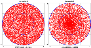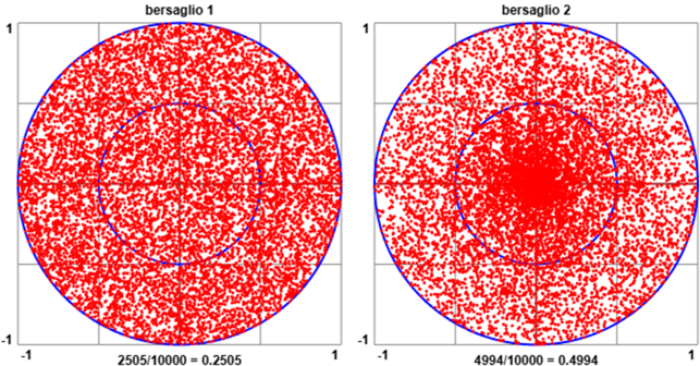 Mentre col primo i proiettili si distribuiscono in modo uniforme nel cerchio, col secondo si distribuiscono concentrandosi maggiormente intorno a (0,0). Mentre col primo la frequenza tende a stabilizzarsi su 1/4, pari al rapporto tra area del centro e area del bersaglio, col secondo tende a stabilizzarsi su 1/2: il fatto che il punto generati disti meno di metà raggio dal centro dipende solo dal valore di r, che essendo con distribuzione uniforme in [0,1), ha il 50% di probabilità di essere minore di 1/2.