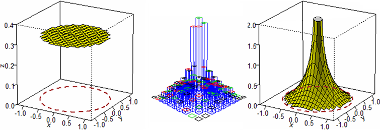 Altri due esempi. A destra è rappresentato un sistema (X,Y) con X e Y indipendenti. Comunque sezioni la superficie con piani paralleli ai piani xz e yz ottengo grafici con andamenti simili: hanno massimo e punto di flesso collocati nella stessa posizione. Potrebbe avere una forma simile (anche se non centrata in (0,0) e con diverse unità su gli assi) la distribuzione di (X,Y) con X e Y altezze di un uomo e una donna sorteggiati a caso. Invece, nel caso della superficie sotto a sinistra (per la quale a destra abbiamo tracciato un possibile grafico di dispersione sperimentale) siamo di fronte a X e Y non indipendenti; ad es., è evidente che le sezioni parallele al piano yz sono curve con il punto di massimo che man mano si sposta verso destra (avanza lungo la direzione dell'asse y). | ![]() |