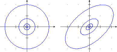 Sotto sono tracciate alcune curve di livello delle due ultimi superfici considerate. Nel primo caso sono ellissi simmetriche rispetto agli assi x e y, nel secondo hanno assi di simmetria obliqui, a conferma del fatto che al crescere dell'uscita X l'uscita di Y tende a crescere anch'essa.