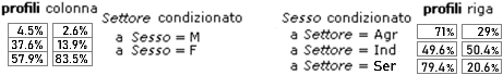 La tabella seguente rappresenta la distribuzione delle variabili Sesso e Settore di attività (classificato in "agricoltura", "industria", "altre attività") in cui una persona (in Italia nel 2012) era occupata: