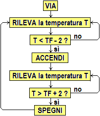 Nell'esempio precedente i dati sono T (fornito dal termometro) e TF (introdotto dall'utente), mentre la sequenza di controlli, cambiamenti di stato di interruttori,