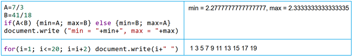 Vedremo in un successive voci (Calcolatore 2, Calcolatore 3) qualche approfondimento sulla programmazione. Vediamo ora un paio di esempi di programmi realizzati nel linguaggio di programmazione ("JavaScript") incorporato nella applicazione con cui stai visualizzando questa pagina, lo stesso linguaggio con cui sono realizzati questi script, su quale ci soffereremo successivamente (segnaliamo solo che "if" ed "else" stanno per "se" e "altrimenti", e che "for(i=1,i<=20,i=i+2)" sta per "per i che vale 1, 3, ..., 19").