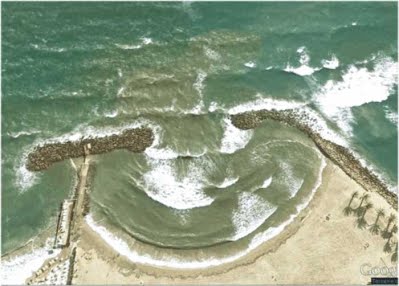 La foto sotto a sinistra illustra un fenomeno che dovremmo avere osservato già molte volte: arriva un fronte d'onde marine che si propaga descrivendo delle rette parallele e che quando passa attraverso l'apertura tra i due moli prosegue in modo quasi circolare. Sotto a destra un'animazione illustra in modo schematico il fenomeno.