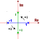 per un numero reale è interpretabile come una omotetia; proviamo a interpretare geometricamente la moltiplicazione per i: 1 per i sappiamo che fa i; quindi il "vettore 1" è stato ruotato di 90° -1 per i sappiamo che fa -i; quindi il "vettore -1" è stato ruotato di 90° Definiamo in modo analogo "i per i": i, ossia (0,1), ruotato di 90° diventa il vettore | ![]() |