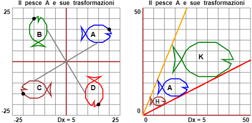 Abbiamo anche visto anche come realizzare simmetrie rispetto all'asse x e all'asse y e trasformazioni di scala, come quelle raffigurate sopra a destra: