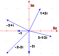 Sopra sono rappresentati vari numeri complessi. Tra questi vi è anche un numero con parte reale nulla (-2i, rappresentato da un vettore verticale) e uno con parte immaginaria nulla (-1, rappresentato da un vettore orizzontale), ossia un numero complesso che è anche un numero reale. Con le convenzioni usuali, -2-2i sta per -2+(-2)i, ossia ha -2 come parte immaginaria.