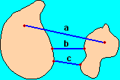 Abbiamo visto vari modi in cui si può definire una distanza tra punti in un dato spazio. Soffermiamoci sul caso della distanza euclidea nel piano, e cerchiamo di generalizzare le nostre considerazioni affrontando il problema della distanza tra figure.Partiamo da un esempio realistico. Che cosa devo intedere come distanza tra due isole di un lago come quelle raffigurate a lato? Posso considerare la distanza tra un dato punto dell'una e un dato punto dell'altra. Nel disegno sono evidenziate alcune possibili scelte di questi punti. In genere, di fronte a situazioni come queste, si considerano i due punti sulle coste delle due isole che sono più vicini, ossia si intende con distanza la lunghezza del tratto in barca più breve che consente di passare da un'isola all'altra (c nel nostro caso). | ![]() |