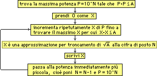 Ecco un diagramma, riferito al calcolo della radice quadrata di un generico numero positivo A, che risponde a questi requisiti, anche se non rappresenta l'algoritmo che nella realtà seguono le CT. Si tratta di un procedimento in cui si trovano approssimazioni per troncamento di √A con man mano più cifre: trovata una approssimazione, la successiva approssimazione viene trovata incrementando ripetutamente l'ultima cifra, fino a che non si trova un quadrato che eccede A.