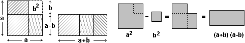 Il quoziente è a + b e quindi: a2 b2 = (a b)(a + b) Questa e altre scomposizioni (e gli sviluppi / espansioni che si ottengono leggendo alla rovescia le equazioni: lo sviluppo di (a-b)(a+b) è ) sono ricavabili anche interpretando la moltiplicazione come prodotto di lunghezze: |